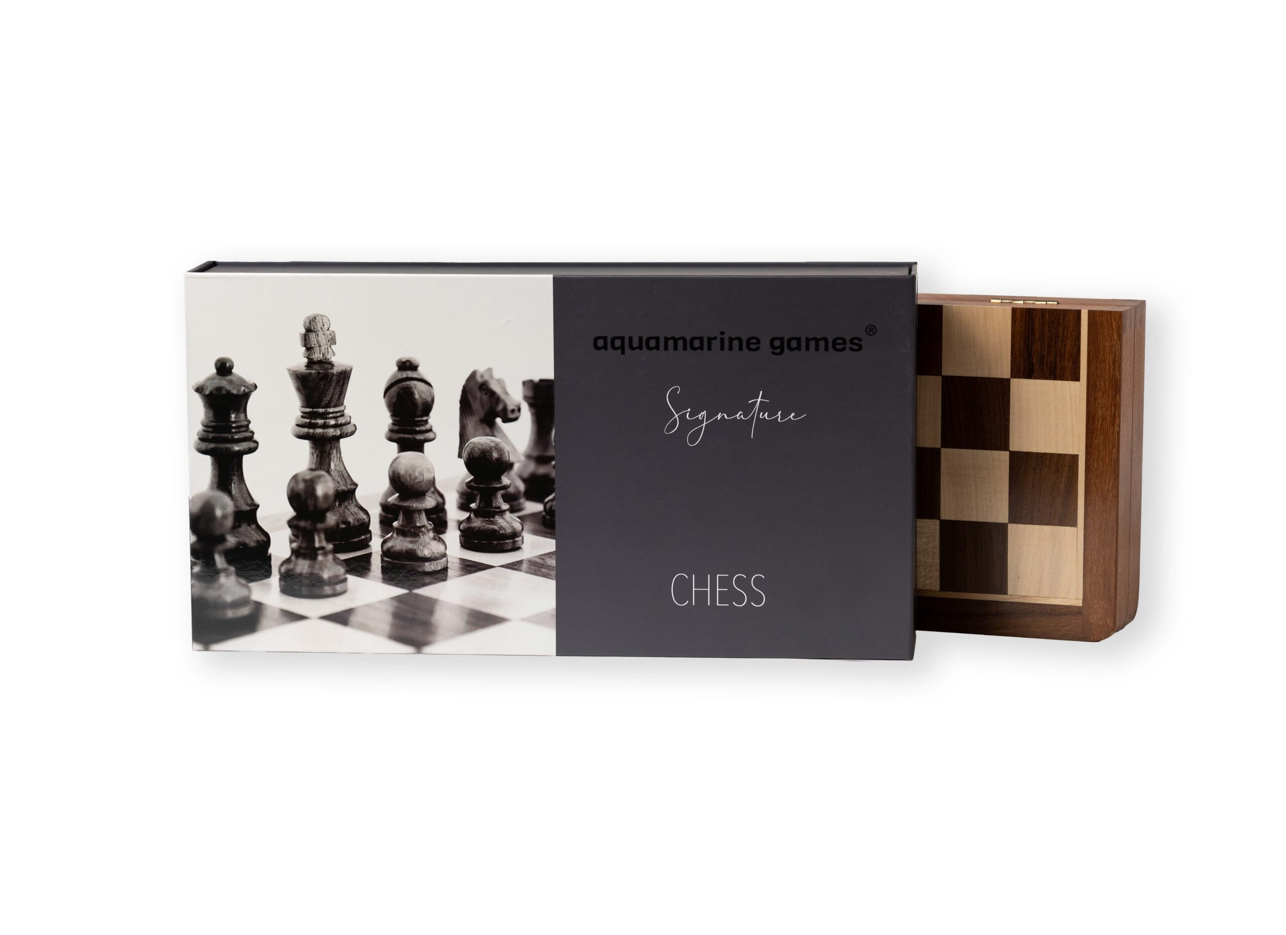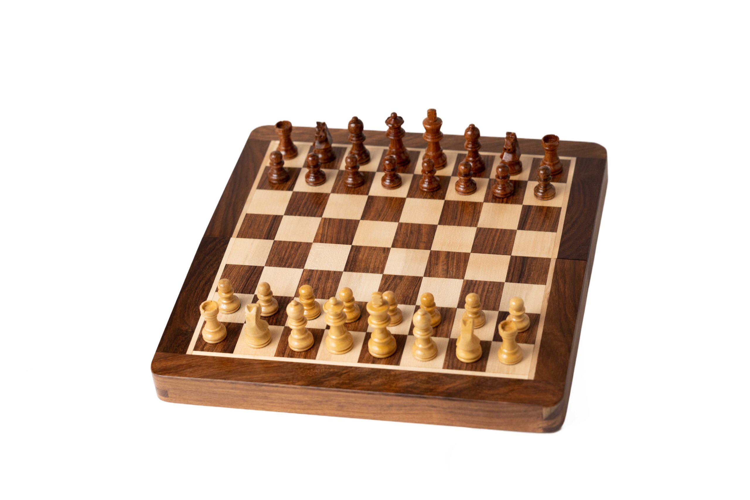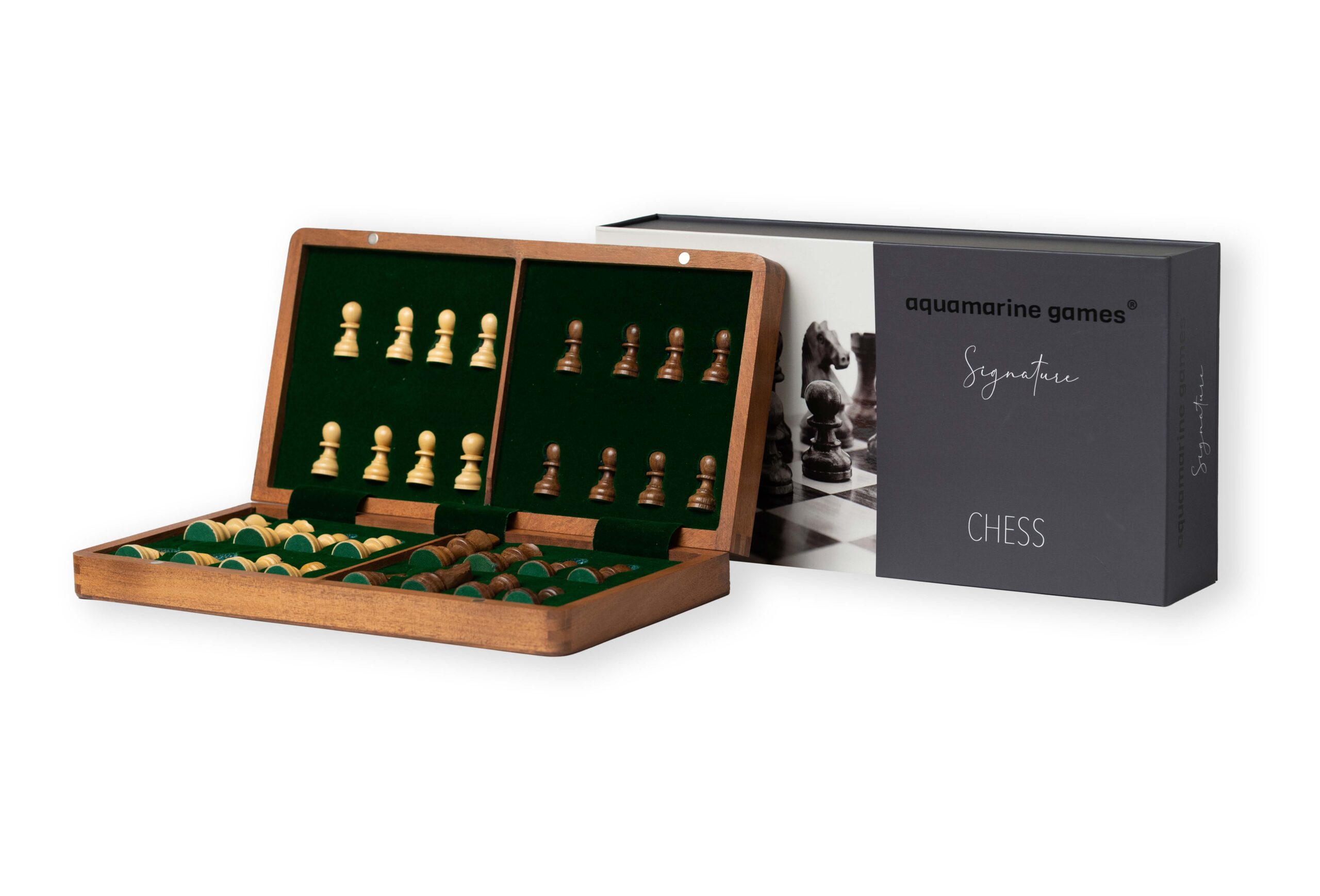 Las piezas tienen un diseño tipo Staunton alemán y se guardan en su interior protegidas y en perfecto orden.